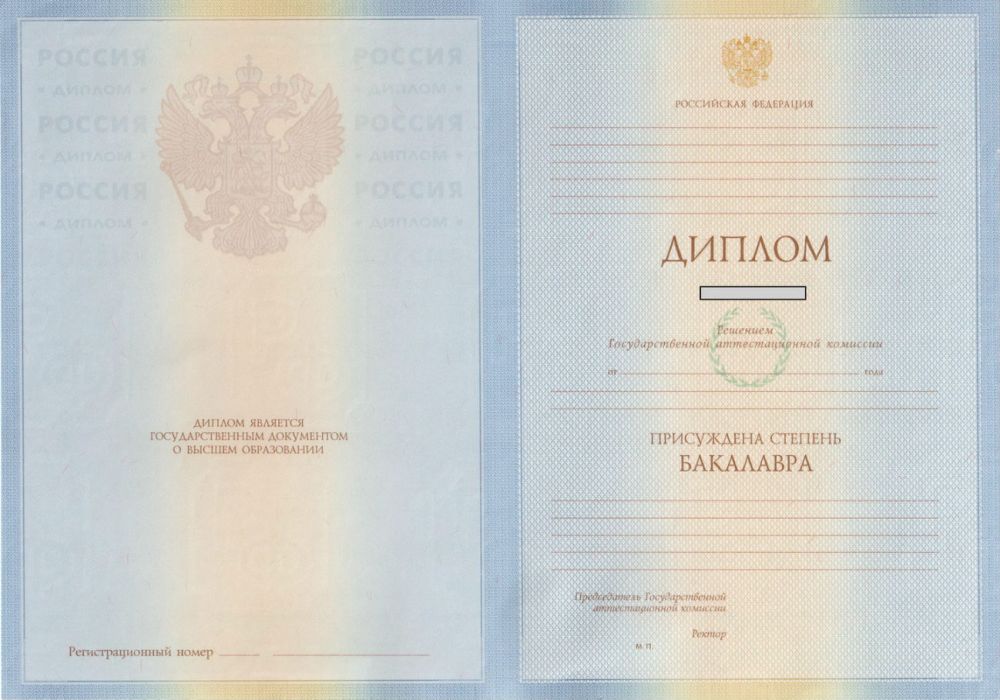 Диплом бакалавра образца 2014-2024 года состоит из титула, заключенного в твердую обложку синего цвета, и приложения. На обложке вытиснены герб РФ и надпись «ДИПЛОМ О ВЫСШЕМ ПРОФЕССИОНАЛЬНОМ ОБРАЗОВАНИИ». Титул выполнен на листе формата А4, приложение – формата А3. Все листы документа, выполненные с преобладанием голубого оттенка, содержат информацию о предприятии - изготовителе с указанием года выпуска бланка.