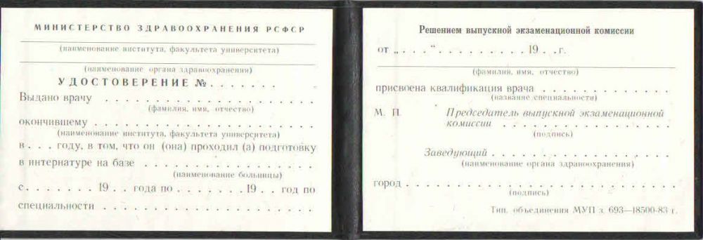 Форма документа установлена приказом Минздрава СССР, изданным в январе 1982 года. Согласно приказу, удостоверение интернатуры образца до 1992 года – это бланк, который заключен в твердую обложку черного цвета. На лицевой стороне документа содержится надпись «Удостоверение». Разворот документа – это бланки белого цвета с графами для заполнения.